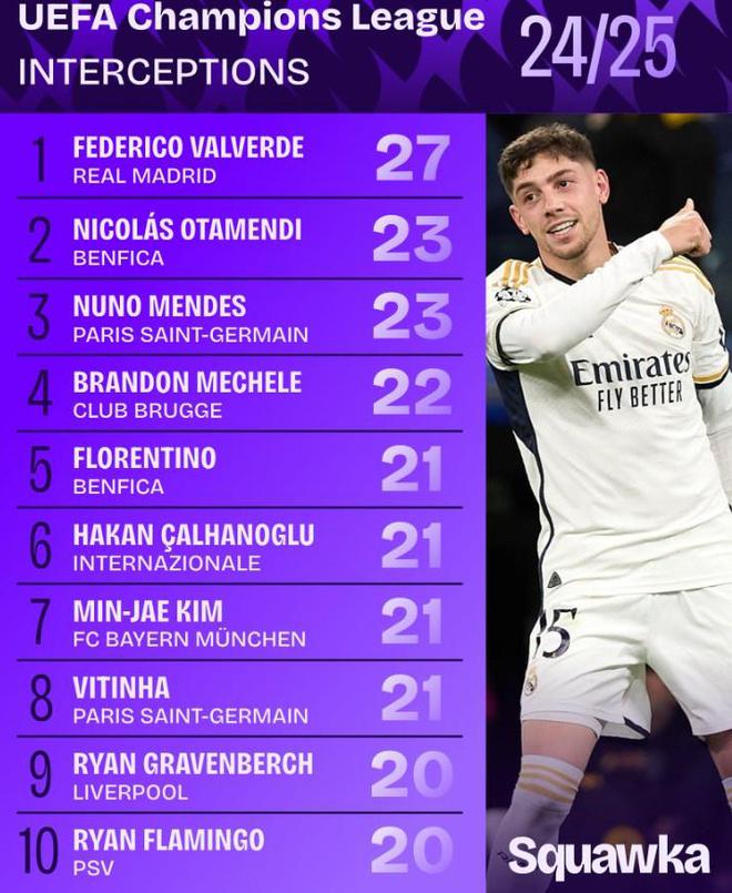 24/25赛季欧冠拦截榜:巴尔韦德27次列首位,努诺-门德斯第三